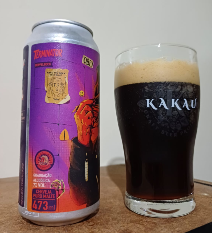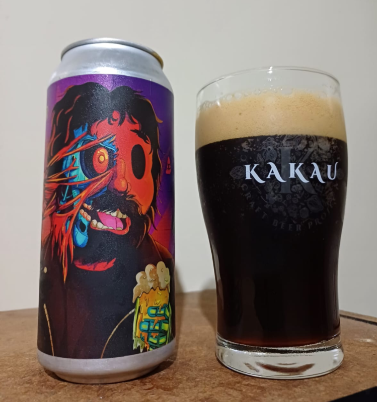 Cerveja de coloração marrom escuro, líquido opaco e espuma cremosa de boa formação...bem bonita!