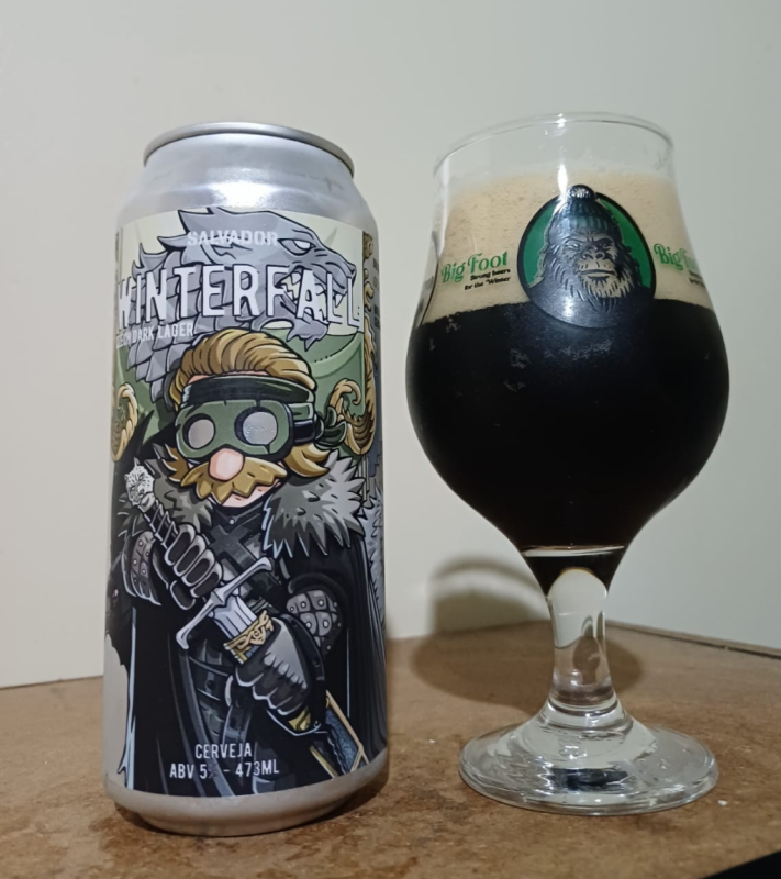 Cerveja de coloração marrom enegrecida, líquido opaco e leve espuma cremosa!
