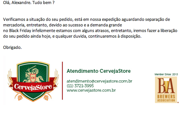 Minha 2ª compra foi dia 29/11, agora válido na Black Friday, e nada até agora também... informação sobre entrega, sobre algum problema com algum item... fiquei meio assim de comprar com eles novamente, mas os preços estavam bons e eles tem muitas opção de breja mesmo. Então dei mais um voto de confiança.