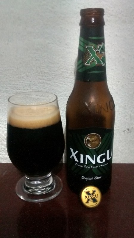 Cerveja escura, de coloração preta, líquido opaco e formação de uma espuma bege, cremosa e de media dissipação.
