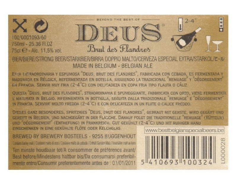 DeuS, or Brut des Flandres, is a Bière de Champagne with 11.5% ABV served in 75cl bottles.