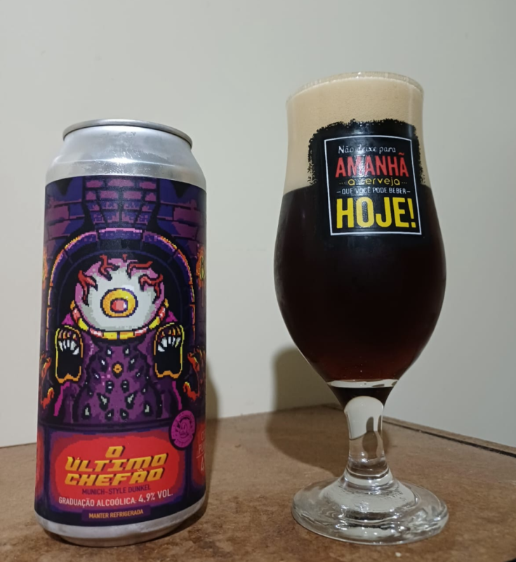 Só que aqui o rolê é outro: cerveja marrom profundo, espuma que segura a cena e aquele aroma de pão escuro, biscoito e caramelo que já entrega quem manda na mesa.