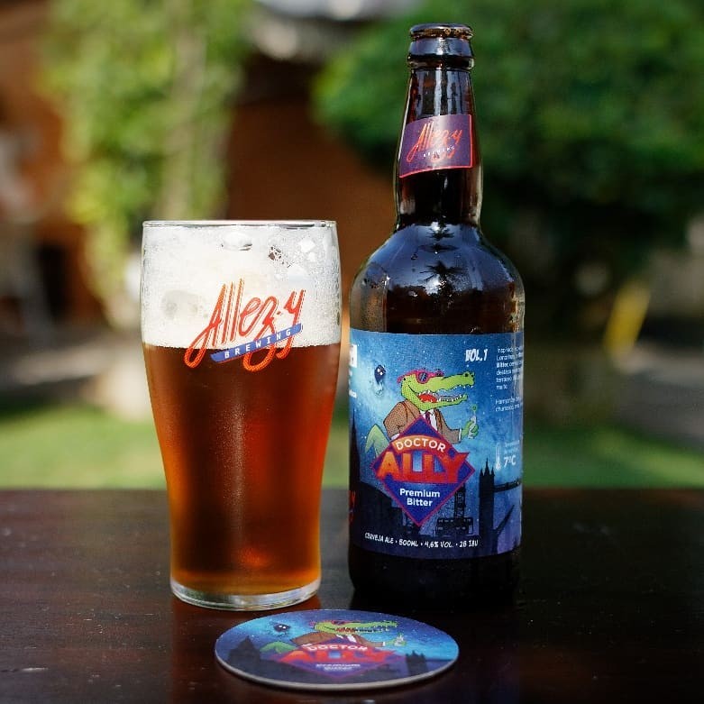 Inspirada no estilo mais popular dos pubs Londrinos, a Doctor Ally é uma Premium Bitter, cerveja de baixa carbonatação que se destaca pelo balanço entre o aroma herbal e terráceo de lúpulos britânicos e o sabor do malte.