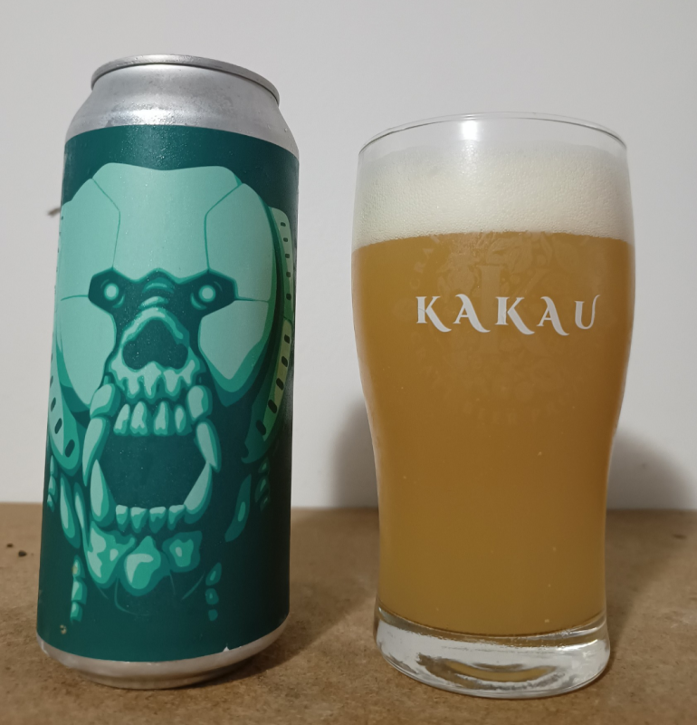 Cerveja de coloração amarelo claro, líquido opaco e espuma cremosa branca de média formação.
