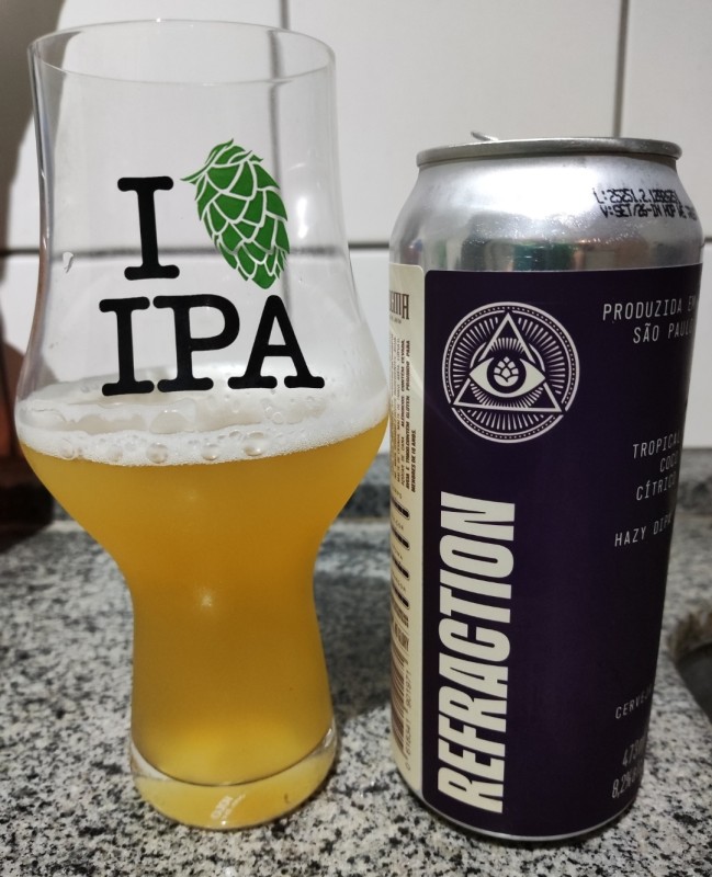 Refraction é uma Double IPA em que usamos os lúpulos Mosaic e Sabro, fermentada com nossa levedura exclusiva Fruit Cream.