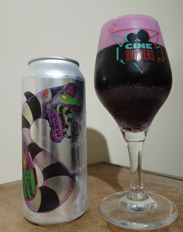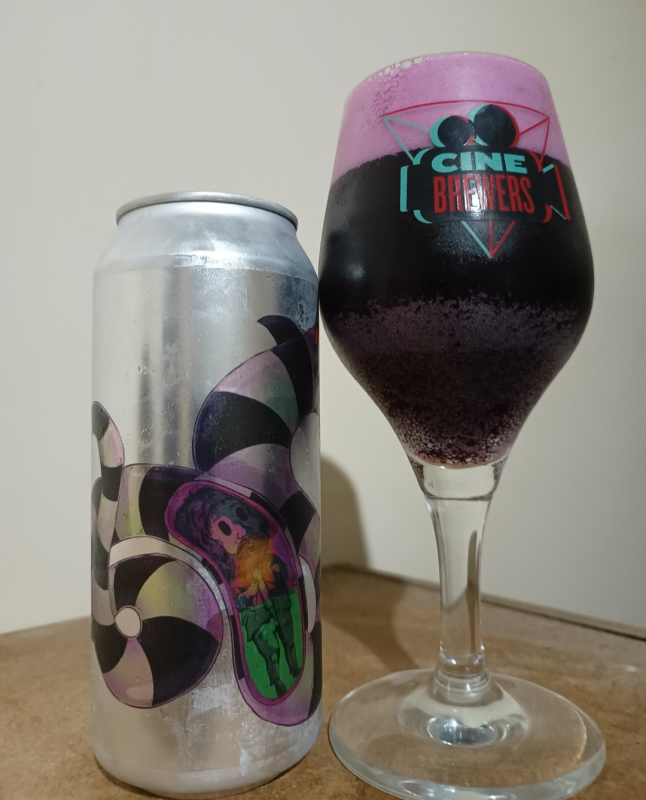 Cerveja de coloração roxa, líquido opaco e espuma também roxa de belíssima formação.