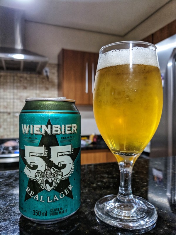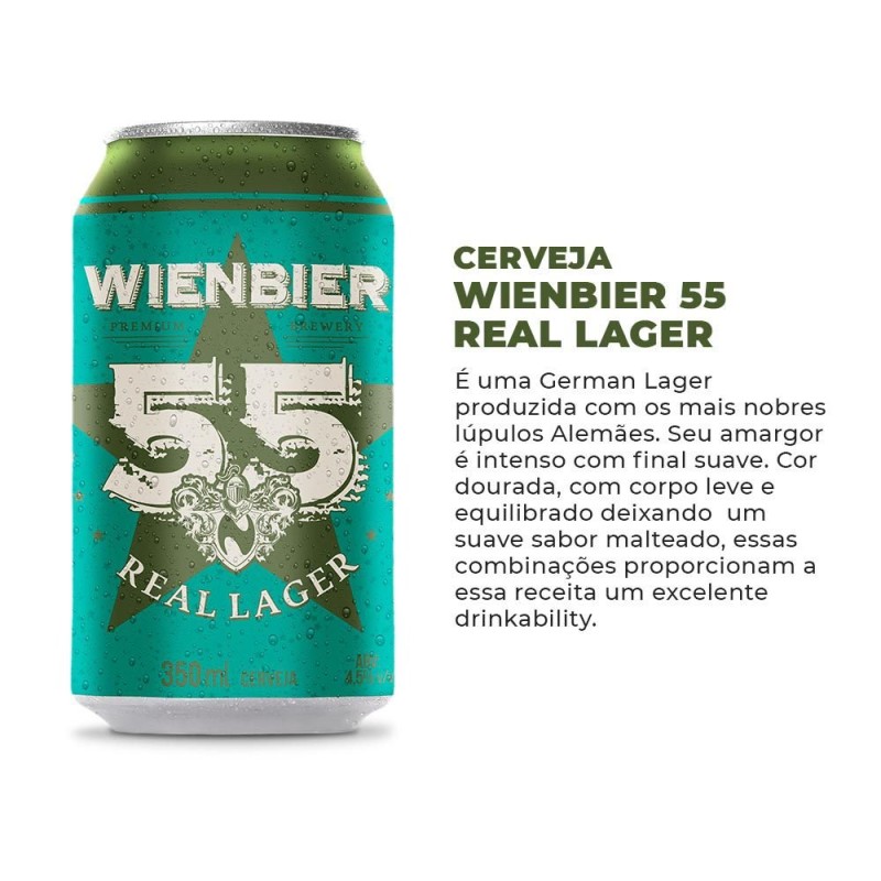 A Wienbier 55 Real Lager é uma German Lager produzida com os mais nobres lúpulos Alemães da região de Hallertau, seu amargor é intenso com final suave, seus aromas de lúpulo arremetem à terroso e herbal.