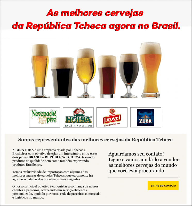 A BIRATUBA IMPORTADORA TCHECA BRASILEIRA vai trazer as melhores cervejas daquela região e a BrouCzech será a primeira, aliás já está sendo comercializada, as próximas a desembarcarem aqui serão: NOVÁ PAKA, LITOVEL, ZUBR, HOLBA e outras mais. Além também de matérias primas originais da República Tcheca.